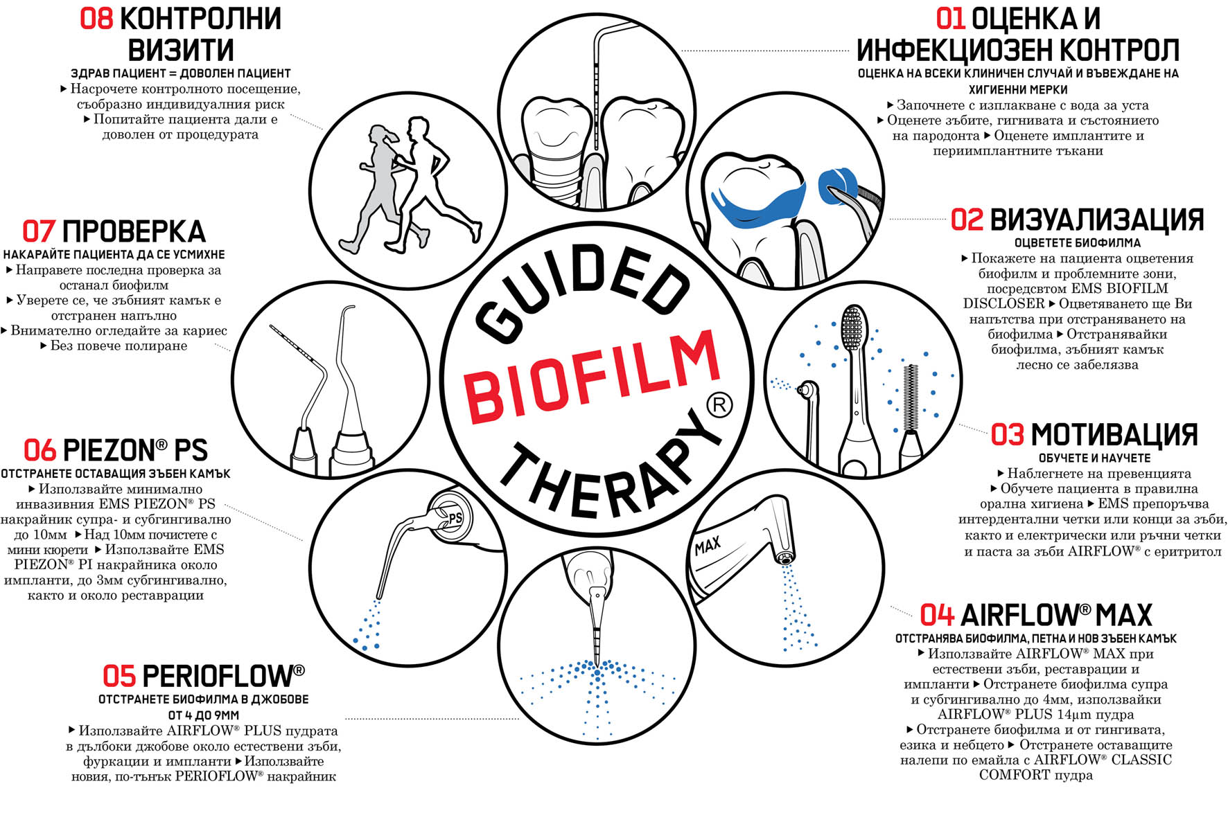 Адекватната профилактика трябва да се основава на причините за заболяването. Следователно протоколите трябва да следват новите научни открития. В миналото основният фокус бе върху отстраняването на зъбния камък и плаката (биофилм) с ръчни инструменти. Това обаче води до ненужна загуба на зъбни структури и увреждане на меките тъкани. Днес, в допълнение към ефективното контролиране на биофилма, фокусът е върху запазването на тъканите и комфорта на пациента и на зъболекаря. Контролираната биофилм терапия GBT (EMS Nyon, Швейцария) дава възможност да се отговори на съвременните изисквания с ясно определена процедура и подходящи инструменти. Важно е да се следва тази системна процедура, тъй като тя улеснява провеждането на профилактиката (2).