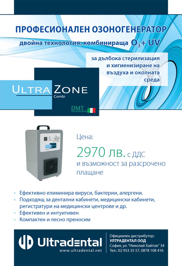 Професионален озоногенератор. Двойна технология, комбинираща Oз + UV за дълбока стерилизация и хигиенизиране на въздуха и околната среда. Цена 2970 лв с ДДС с възможност за разсрочено плащане. Предлага се от фирма “Ултрадентал”.