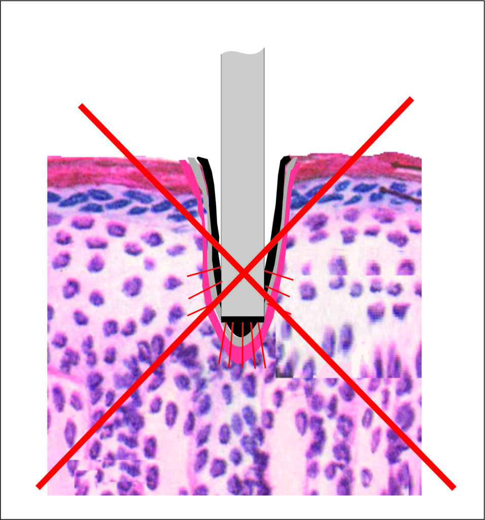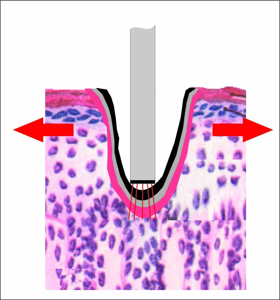 За избягване на този ефект е необходимо полученият начален срез леко да се разтваря с помощни средства. По този начин да се избегне максимално допирането на вече разрязана тъкан до страничните повърхнини на световода. Активираният връх на световода трябва да се плъзга бавно по мястото на среза. Дълбочината на среза обикновено е от 0,3 до 0,5 мм, така че разрязването се извършва с няколкократни бавни преходи. Така могат да се постигнат различни дълбочини на среза с посочените вече ефекти.