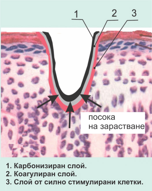 При работа с традиционния скалпел зарастването започва от мястото на съшиването. Докато при работа с лазер заздравяването започва от силно активираните клетки от дъното на разреза към началото му. Това определя и специфичната характеристика на заздравялата рана – бързо възстановяване, без ръбци и без белези.